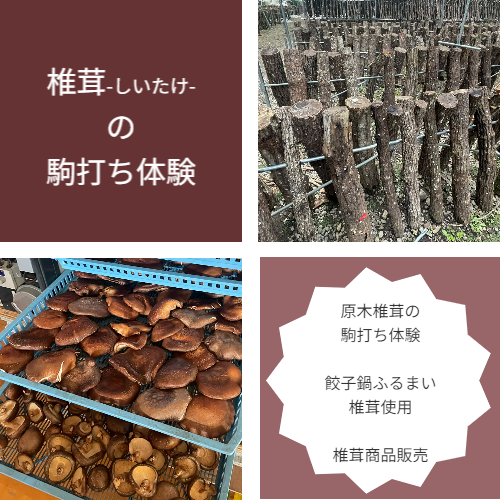 ★椎茸駒打ち体験と椎茸・乾燥椎茸の販売を行います。会場で行われる餃子鍋のふるまいにも椎茸を使用しています。
