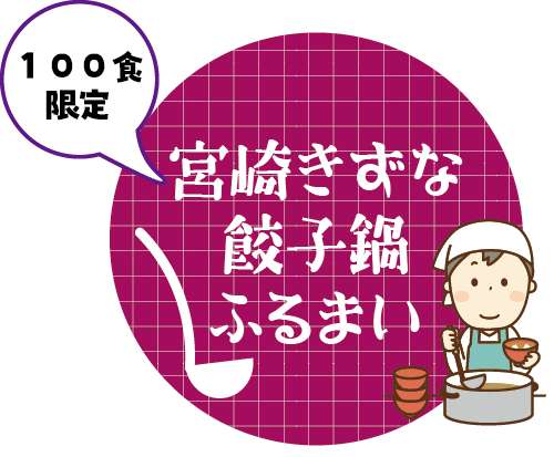 今回のイベント参加者の生産物・加工品などを使用して作った「宮崎きずな餃子鍋」のふるまいを行います!